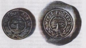 Widok stempla i odcisku pieczęci gminnej Gminy Pobitno, używanej od lat osiemdziesiątych XIX [w:] Wiktoria Hewin, Wiesław Walat; Herb Osiedla Rzeszów – Pobitno; Rzeszów – Pobitno 2007