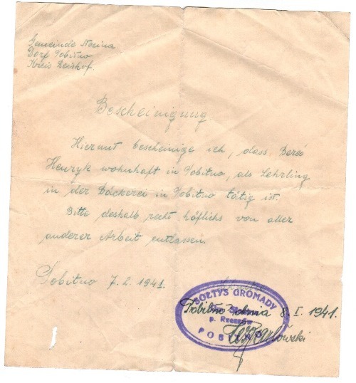 Zaświadczenie wydane przez sołtysa wsi Pobitno Jana Barłowskiego (ze zbiorów MC) „Gmina Słocina Wieś Pobitno Powiat Reishof ZAŚWIADCZENIE Niniejszym zaświadczam, iż Henryk Bereś zamieszkały we wsi Pobitno jest zatrudniony jako praktykant w piekarni w Pobitnie. W związku z tym uprzejmie proszę o zwolnienie go ze wszystkich dodatkowych prac. Pobitno 7.2.1941 Jan Barłowski”